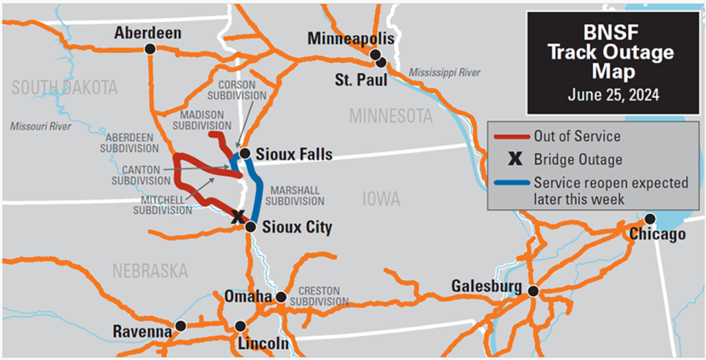 “Repair materials and equipment are staged in multiple locations across the impacted areas and belt trains are moving both north and south around the clock to bring in ballast, the main components for the tracks on which BNSF trains operate, to repair the track. Some locations, including the bridge repair in North Sioux City, S.Dak. across the Big Sioux River, will require more extensive repair work before service can be restored.While BNSF operating teams are re-routing some trains, we have issued some temporary embargoes to proactively manage traffic flows through this impacted area.”