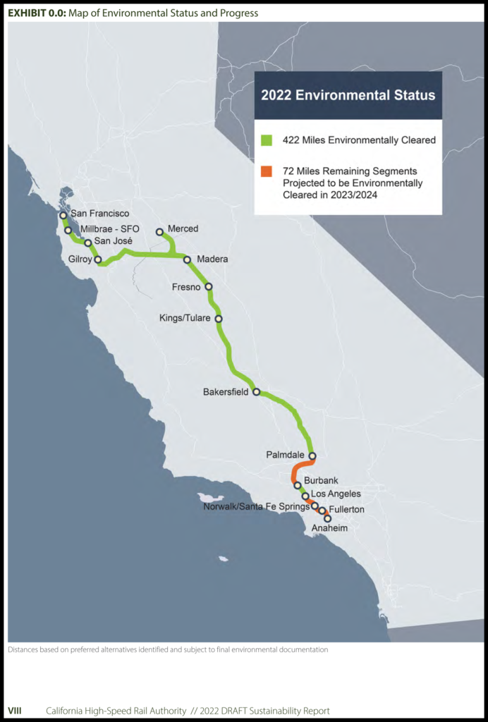 California high-speed rail is currently under construction along 119 miles in the Central Valley at 35 active job sites. The 500-mile Phase 1 system is slated to extend from San Francisco to Los Angeles/Anaheim; 422 miles have already been environmentally cleared (see map below).