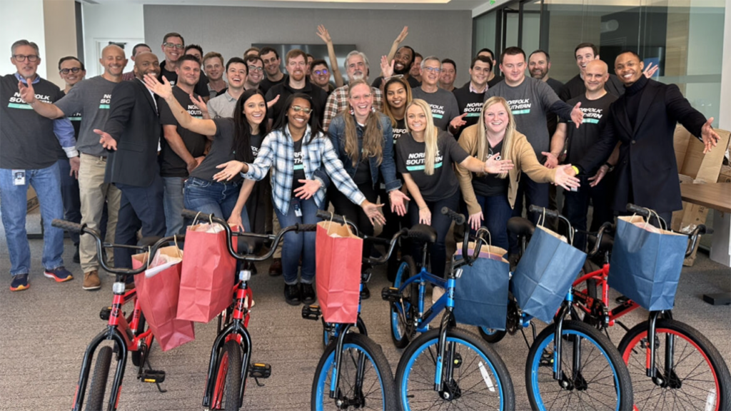 NS’s Financial Planning & Analysis department members with the children’s bicycles and toys they assembled for the Atlanta Fire Rescue Foundation. (Caption and Photograph Courtesy of NS)