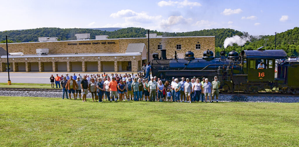Drawn by 1916 Baldwin Locomotive Works 2-8-2 Mikado engine No. 16, the five-car special arrived at the trackside Southern Huntingdon County High School campus after a 2½-mile run from EBT’s headquarters at Rockhill Furnace, Pa.