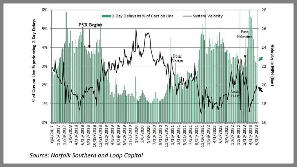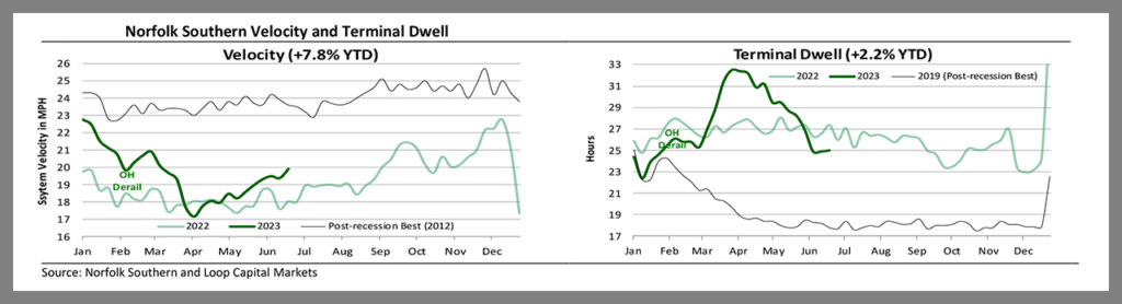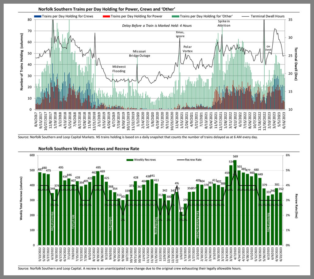 After a pause, network velocity is resuming its pattern of incremental improvements and as of June 16 sat at a 15-week high; albeit still below where it was prior to East Palestine. Trains holding for crews deteriorated a little to 21 per day, from 18 the week prior, and trains holding for power remained in much better shape at seven per day. Remember the two issues here are the capacity bottleneck at East Palestine until the soil remediation is complete and both tracks are back in service and running at full speed in July, and the March change in train makeup standards, primarily impacting NS’s non-intermodal businesses.