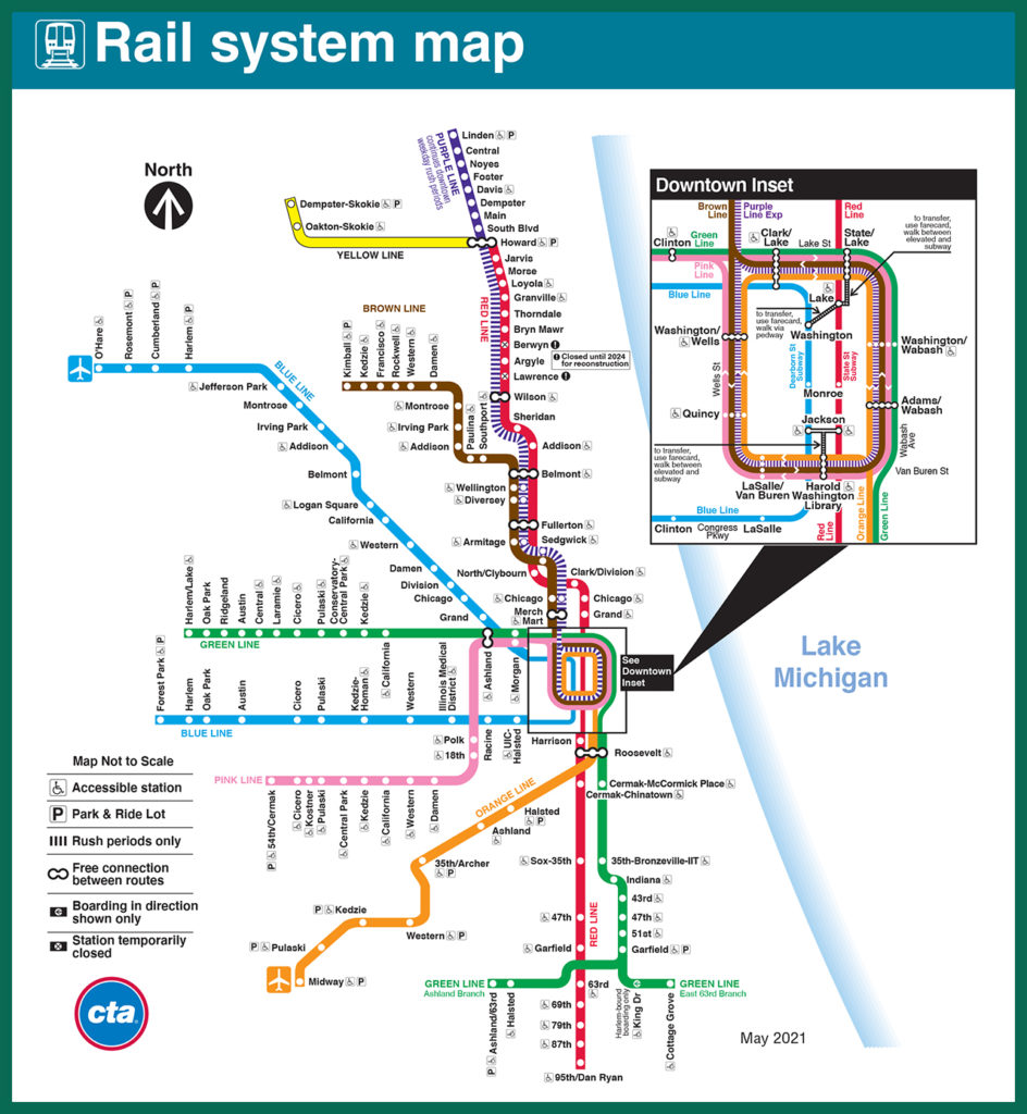 To get around the city, visitors and Chicagoans alike use the CTA. The agency is celebrating its 75th anniversary on Oct. 1. Transit in Chicago goes back much further, though. Chicago’s famous elevated (or “L”) lines were built in the 1890s, and the South Side Elevated Railroad took visitors to the Columbian Exposition in 1893, one year late to celebrate the 400th anniversary of Christopher Columbus’s first voyage. Today’s system has eight lines, reaching as far north as Evanston (home of Northwestern University), as far west as Oak Park (famous for buildings designed by Frank Lloyd Wright) and as far south as 95th Street, with an extension planned that would take the Red Line to 130th Street, as part of the CTA’s “Red Ahead” program.