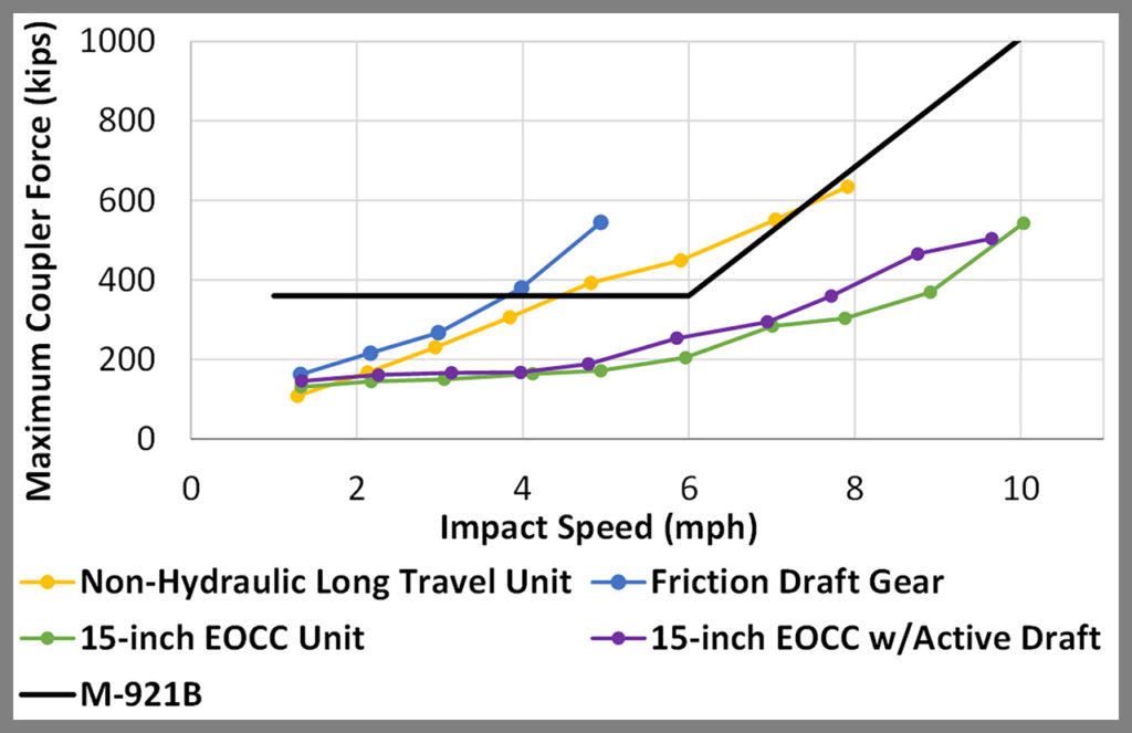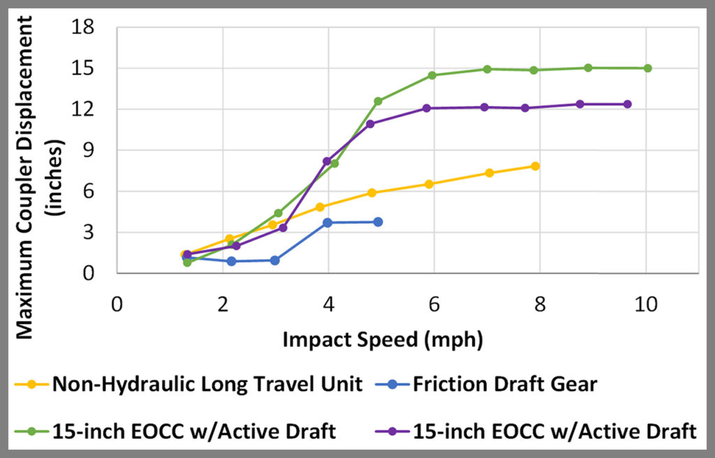 The impact results showed that the standard 15-inch EOCC unit provided the lowest forces and accelerations in the tests because it was able to absorb more energy over its long displacement stroke. The 15-inch EOCC unit with active draft provided a similar level of impact protection as the standard EOCC unit despite a slightly decreased displacement stroke. The results of the friction draft gear impact test showed a decrease in impact performance compared with the EOCC units, including higher forces and accelerations, due to its smaller displacement stroke and limited energy absorption capacity. The non-hydraulic long-travel unit provided more impact protection than the friction draft gear, and this system nearly met the M-921B impact performance for evaluating hydraulic EOCC units.
