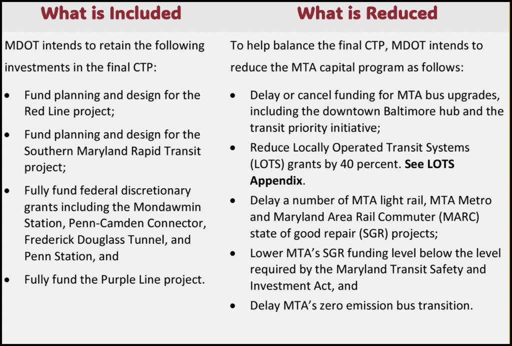 The final, nearly $20 billion CTP will be released in January. The six-year program, MDOT said, will include “corresponding reductions across the department while maintaining an essential focus on safety, maintenance and strategic investment.” It noted that the updated program retains project development funds for Baltimore’s Red Line, Southern Maryland Rapid Transit, the Frederick Douglass Tunnel Project, the replacement American Legion Bridge and other key projects.
