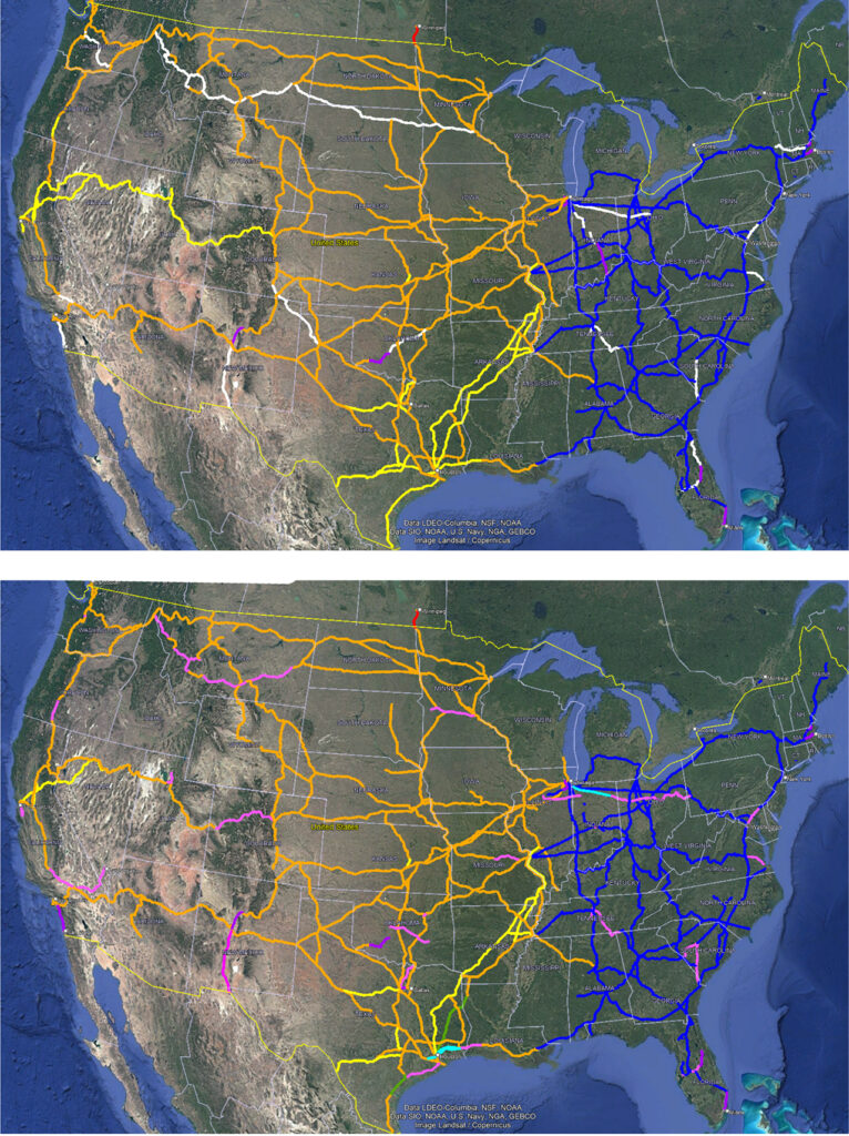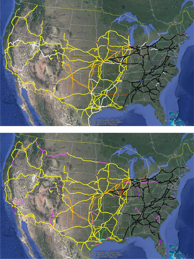 - White: Lines currently owned by the railroad in the “Current” map designated for either full or partial ownership transfer; or trackage rights access when competitor does not desire ownership.