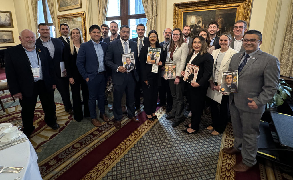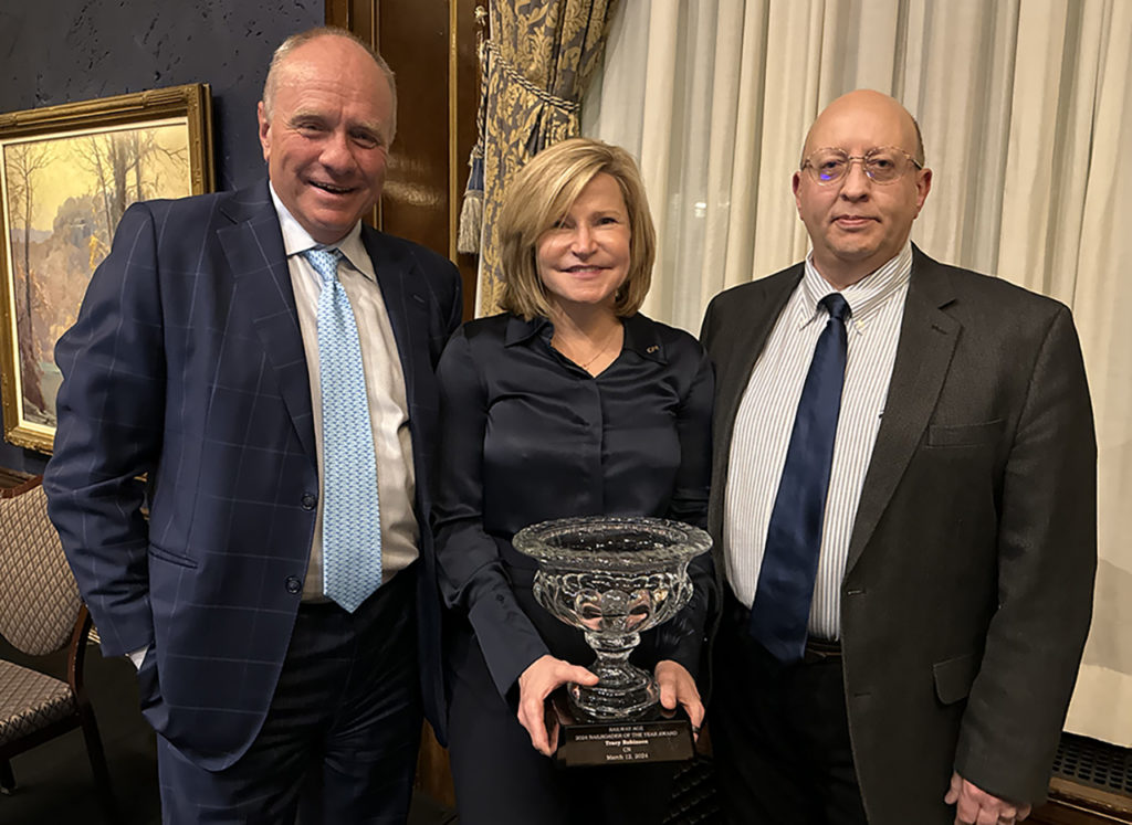 Vantuono with Union Pacific CEO Jim Vena, who takled about the railroad’s improving service and safety metrics. He went into considerable detail about Precision Train Builder, a platform developed by UP subsidiary PS Technology for train consist makeup. Vena also candidly commented on the recent public statements issued by the STB and FRA on safety.The event included a luncheon recognizing the 2024 honorees of Railway Age’s “Fast Trackers” 25 Under 40 awards.Railway Track & Structures Editor-in-Chief David Lester (left) with CN Vice President Engineering and RT&S 2023 Engineer of the Year Brent Laing.Genesee & Wyoming President and CEO Michael Millerdiscussed how “People Matter Most” with Railway Age Senior Editor Carolina Worrell.G&W railroads collectively have led the short line industry in safety since the early 2000s, and have also received more than 1,000 Jake Awards with Distinction from the American Short Line and Regional Railroad Association. These are both “tremendous accomplishments, considering that short line railroads handle significantly more switching and short line employees move on and off rail equipment considerably more than Class I railroaders,” he noted.Vantuono (left) with Norfolk Southern AVP Enterprise Data & Analytics Mabby Amouie, who explained NS’s collaboration with the Georgia Tech Research Institute (GTRI) on Digital Train Inspection Portals to enhance rail safety across the Class I railroad’s 22-state network. The portals feature cutting-edge Machine Vision Inspection technology; GTRI engineered the hardware, and NS’s Data Science/Artificial Intelligence (AI) and Mechanical teams “built the brains behind the program.”The Digital Train Inspection Portals are equipped with an array of 24-megapixel trackside cameras and stadium lighting. Together, this Machine Vision Inspection technology captures ultra-high-resolution, 360-degree images of passing railcars. The cameras are synced to the microsecond, taking 1,000 images per railcar on average as they pass through the tunnel at speeds up to 70 mph. The high-speed cameras are strategically placed at angles to capture things that are difficult to detect with the human eye during stationary inspections. In addition, capturing images while the train is in a dynamic state provides an inspection for various defects that cannot be done while the train is stationary.Tracy Robinson (right), President and CEO of CN and Railway Age’s 2024 Railroader of the Year, engaged in a “fireside chat” with Railway Age Editor-in-Chief William Vantuono (left) and discussed how the North American supply chain is changing, as well as its growth opportunities.Railroads have long-term physical assets (locomotives, rolling stock, track, signals, etc.) and fixed infrastructure—lots of sunk investment. Transportation market dynamics and supply chains are constantly shifting, evolving. It’s a tough balance. Robinson elaborated on how CN is addressing this. Robinson also discussed climate change and its impact on railroads. In recent months, the climate has continued to take wild swings, and all over North America we’ve seen blizzards, wildfires, bomb cyclones and tornados, sometimes in the same area, and not very far apart. In Chicago, for example, the temperature shot up about 40-50 degrees (F) from freezing and then nosedived the next day back down to freezing. How does a railroad prepare for that? Respond and recover? What lessons have been learned from dealing with these conditions?Railway Age and Railway Track & Structures Publisher Jonathan Chalon (left) and Railway Age Editor-in-Chief William C. Vantuono (right) presented Tracy Robinson, President and CEO of CN, with Railway Age’s 2024 Railroader of the Year award.Railway Age Senior Editor Carolina Worrell (left) and Railway Age Executive Editor Marybeth Luczak (right) attend the Railroader of the Year dinner honoring CN President and CEO Tracy Robinson.