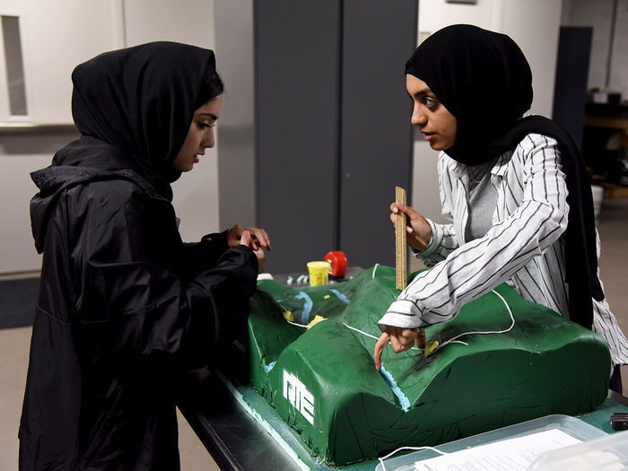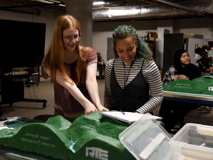 Penn State Altoona students Hagar Abdelaal (left) and Alyonna Vitulli (right) work with Shihui Shen, Professor of Rail Transportation Engineering, during the fourth annual Women in Engineering Design competition. (Credit: Jacob Narup of Penn State)