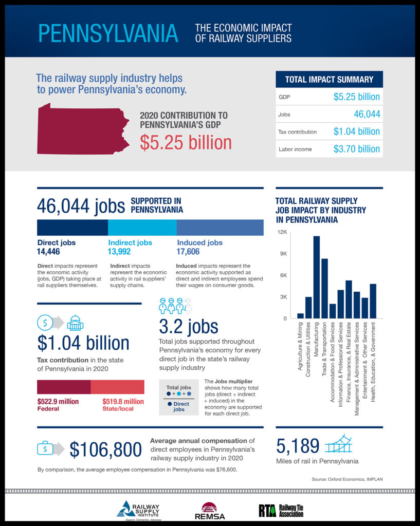 Infographics on the RSI website highlight the rail supply industry impact on GDP, jobs, compensation and tax contribution on a local and state level.