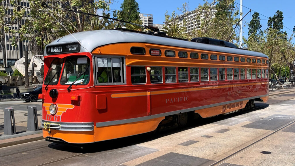 TCUP involves new onboard train control equipment on SFMTA light rail vehicles, which may also include San Francisco’s heritage vehicles like this PCC car in Pacific Electric livery on the F Market & Wharves line.