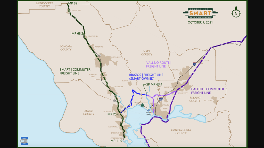 SMART (Sonoma-Marin Area Rail Transit) General Manager Eddy Cumins told the Sonoma Valley Community Advisory Commission that the company’s Board is considering a return to LPG tank car storage in Schellville, a community in Sonoma County, according to a Jan. 29 report by The Sonoma Index-Tribune. SMART runs a 45-mile commuter rail system and offers freight rail service in Sonoma and Marin counties (see map of freight services routes above).