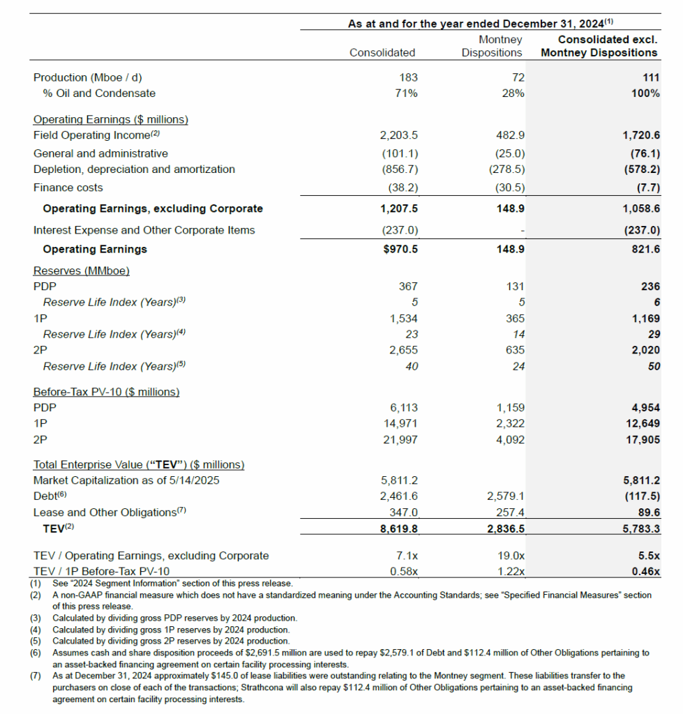Taken together, Strathcona says the disposed assets generated $149 million of operating earnings in 2024 (12% of total Strathcona YE 2024 operating earnings, excluding interest and other corporate items) and had a YE 2024 proved PV-10 before-tax of approximately $2.3 billion (15% of total Strathcona YE 2024 proved PV-10), while the combined sale price represents approximately 33% of Strathcona’s current enterprise value. The table below shows Strathcona’s consolidated results for the year ended December 31, 2024, less the Montney dispositions.