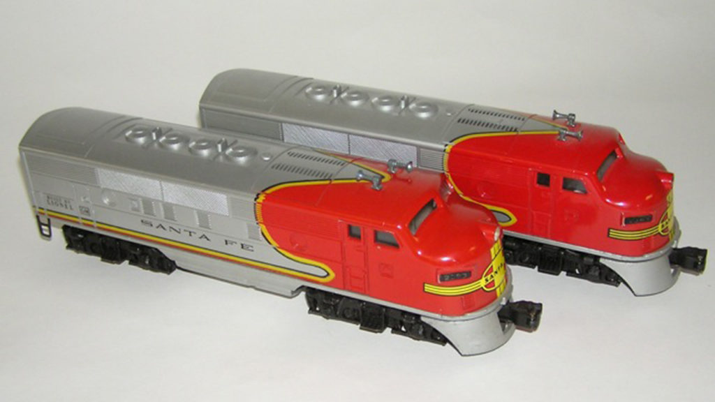 “Uncle Albert” had Lionel trains in his basement, and he would frequently run them for me. My favorite was the Santa Fe Super Chief set with twin EMD F3A units in the famous “Warbonnet” silver and red with yellow trim scheme first used in 1937 (below). I was fascinated with how the pilots (unlike the full-size version) would swing out on sharp curves, to keep the couplers centered.