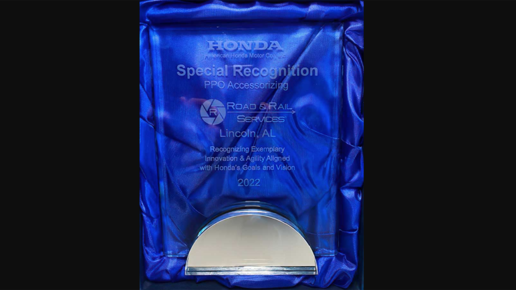 R&RS earned awards for performance excellence and quality service at the recent 2022 Honda Logistics Conference in California. For its “outstanding quality, processing and services,” R&RS was selected as Processor of the Year for Honda’s Marysville, Ohio plant. The company also received a Special Recognition Award (pictured above) for accessory installation services at Lincoln, Ala.; the award recognizes “exemplary innovation and agility aligned with Honda’s goals and vision.” Additionally, R&RS was nominated for a supplier Challenging Spirit Award, which recognizes “support and performance exceeding Honda’s expectations.”