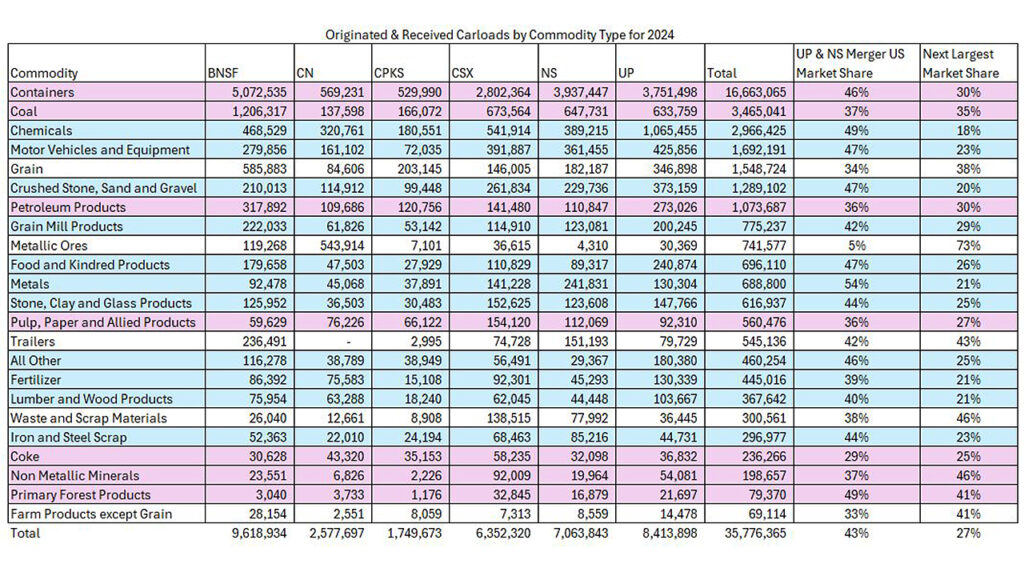 To do this, below I’ve taken 2024 originated and received carload data by commodity (obtained at https://lnkd.in/gfM4niKH) for 2024 for the six Class I railroads in the U.S. I combined Canadian Pacific and Kansas City Southern together as CPKC. I’ve sorted in descending order by total units by commodity and then highlighted in pink commodities where UP+NS has a modest market share advantage, and then blue where UP+NS has a much larger market share. For example, UP+NS substantially eclipses BNSF for intermodal containers, accounting for 46% market share, whereas BNSF has 30%