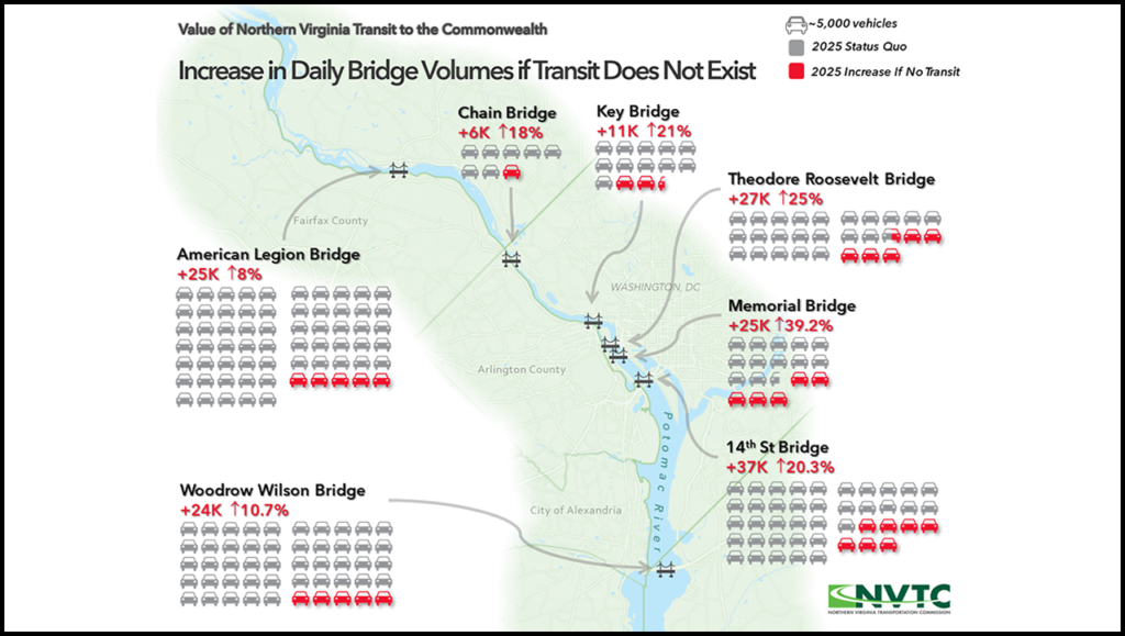 - Without the existing transit network in Northern Virginia, by 2025 the Memorial, Roosevelt and Wilson bridges connecting Northern Virginia to the District of Columbia would each need two additional lanes to accommodate the greater traffic volumes, while the 14th Street Bridge would need three additional lanes. “In addition, the roadway networks within Northern Virginia would come to a complete standstill, affecting the movement of goods and services throughout our region,” NVTC reported.