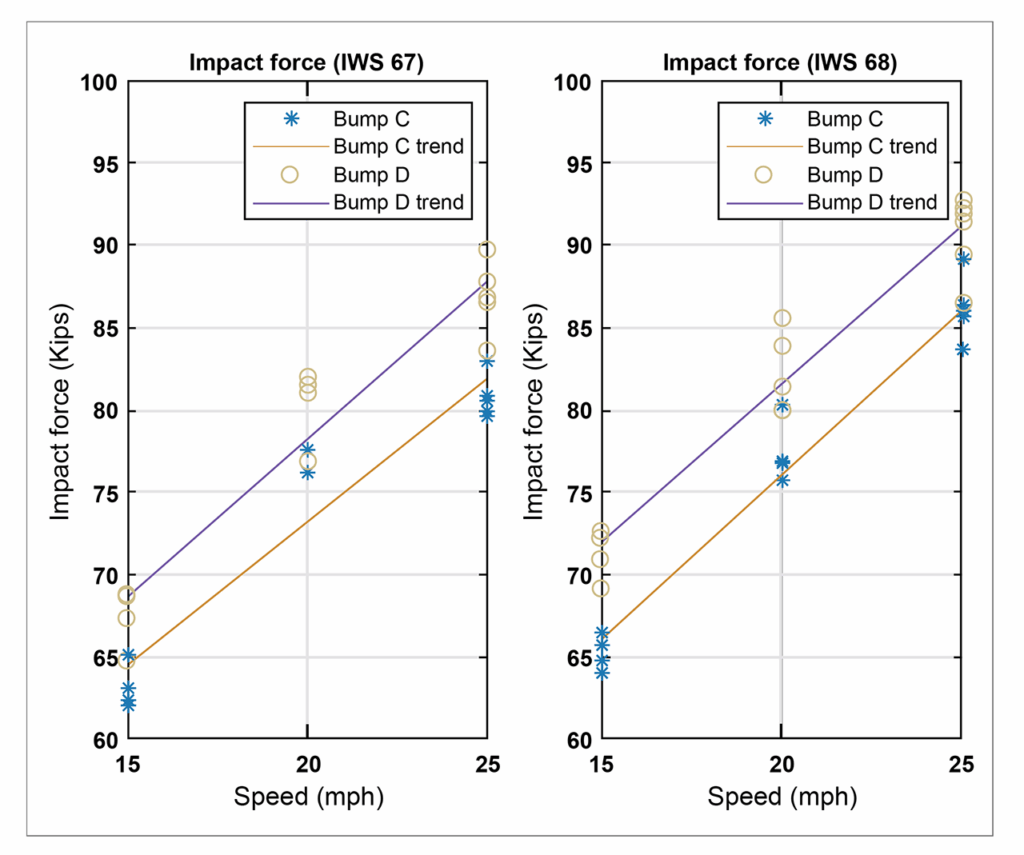 For comparison purposes, PRBs were mounted to the rail with the leading edge (the point where the wheel first makes contact) close to the center of the crib (the space between two crossties). Multiple test passes were performed at different speeds and PRB thicknesses. In total, 162 samples with impact forces ranging from a low of 46.5 kips (1 kip = 1,000 pounds) to a high of 97.7 kips were captured by the IWS. The highest recorded force exceeded the AAR “Actionable” limit of 90 kips, thereby warranting wheelset replacement. Additional analysis was conducted to determine the correlation between IWS and