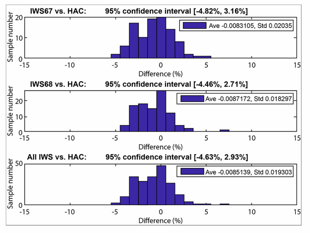 Out of the 162 measurements collected, only one instance exhibited a difference greater than 5% when comparing the two systems’ outputs. Even with this outlier, the data analysis demonstrated that 95% of measurements taken by IWS and HAC for the same wheel pass/impact event were within ±5% (Figure 1a).