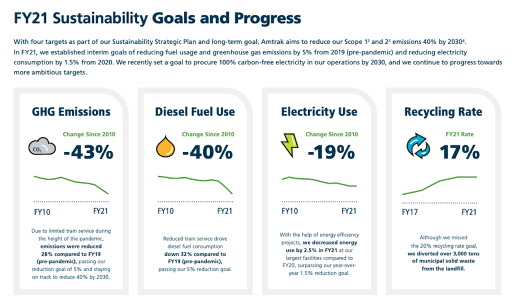 Amtrak has published a sustainability report for FY 2021, highlighting projects across its regions and operations, as well as measured progress against its annual and long-term goals encompassing greenhouse gas (GHG) emissions, diesel fuel and electricity usage.