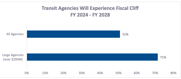 One-half of 122 responding agencies say they are facing a Fiscal Cliff in the next five years, according to a May 2023 American Public Transportation Association (APTA) survey on future potential operating budget shortfalls that many of its public transit agency members are facing.