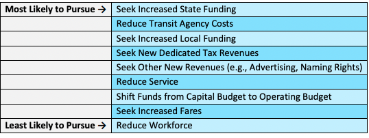According to APTA, responding agencies were presented with a list of potential responses to operating budget shortfalls and were asked to rank them. Agencies, the association says, are “thinking proactively about how to retain riders and grow ridership and are aware that reducing service and increasing fares have negative impacts on ridership.” As one respondent commented, “as we are recovering ridership, fare increases and service cuts are not viable options.”