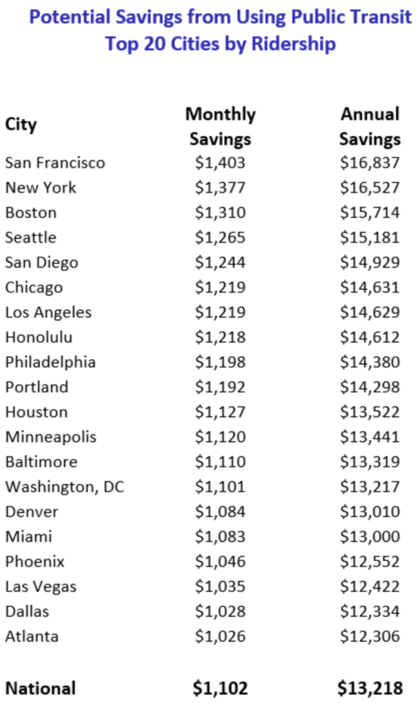 Individuals who use public transportation instead of driving can save more than $13,000 per year, or $1,100 per month, due to auto cost and gasoline price increases, according to the latest Transit Savings report from the American Public Transportation Association (APTA).