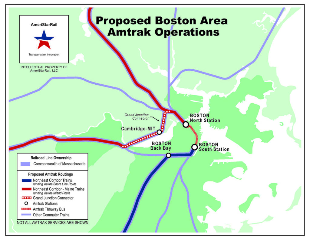 Scott Spencer of AmeriStar Rail has proposed running trains from Springfield toward Boston, then on a circumferential connecting railroad for freight through Cambridge called the Grand Junction Railroad (below), over to the Downeaster Line and into Portland. That connection between the North and South Sides is used for occasional equipment moves, but it has never been used in revenue service.