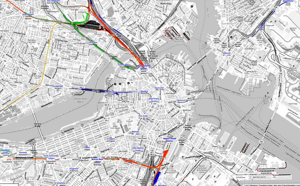There is a local bus between North and South Station at certain times, but there is no direct rail connection on the local transit operated by the MBTA, otherwise known as the T. One way to get there is to take the Red Line subway two stops to Park Street and a northbound car from there to North Station. Another way is to take the Red Line one stop to Downtown Crossing and catch the Orange Line, another subway line, to North Station. If you’re not carrying a heavy bag, Downtown Crossing is only a few blocks from South Station, so that’s a way to get a one-seat ride on rail. Still, it’s not easy to get between the stations, especially for the uninitiated.