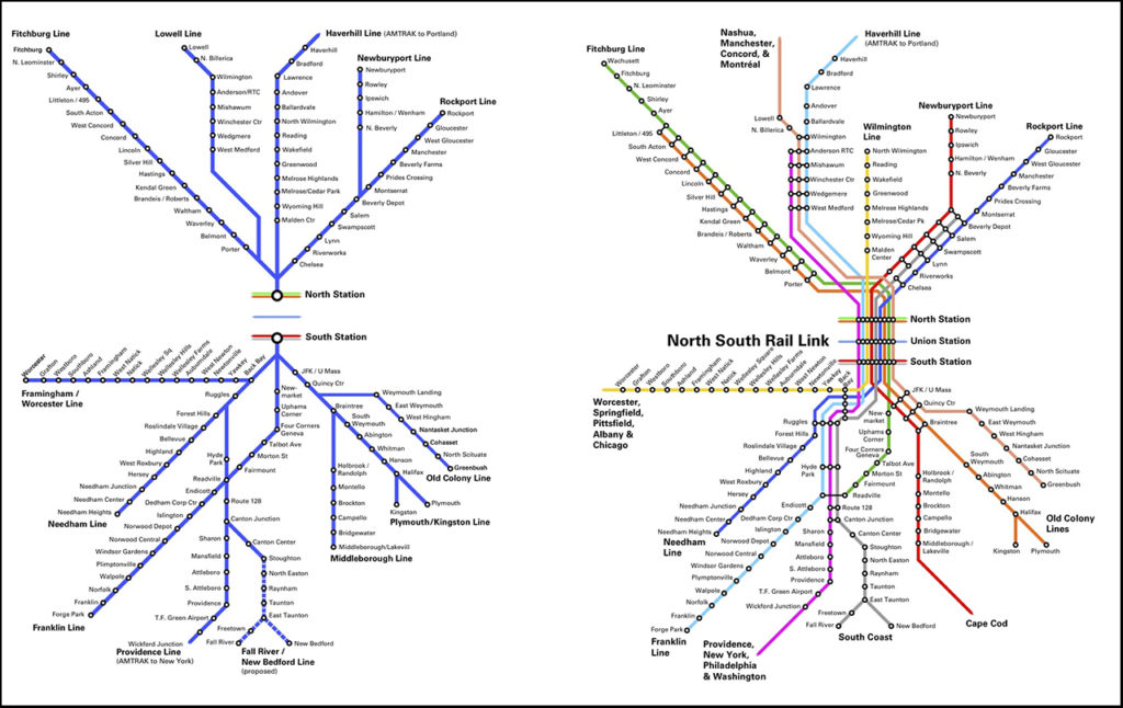 Of course, there is still no such rail component. Much like Philadelphia before SEPTA built the Center City Commuter Connection tunnel that linked the previously separate regional rail systems built and operated by the Pennsylvania Railroad and Reading Railroad, Boston today has two separate rail systems that never meet, except by transferring to at least two MBTA subways. The Northside system originates from North Station and comprise five lines that were once parts of the Boston & Maine Railroad. Amtrak’s Downeaster trains to Portland and Brunswick, Me., originate from there, too. There is also the Southside system, which originates at South Station in the commercial center of downtown Boston. Southside service has three components. Trains on the Boston & Albany line, once part of the New York Central system, go to Framingham and Worcester. The Massachusetts section of Amtrak’s Lake Shore Limited uses that line, going all the way to Albany, and then through Upstate New York and as far as Chicago.