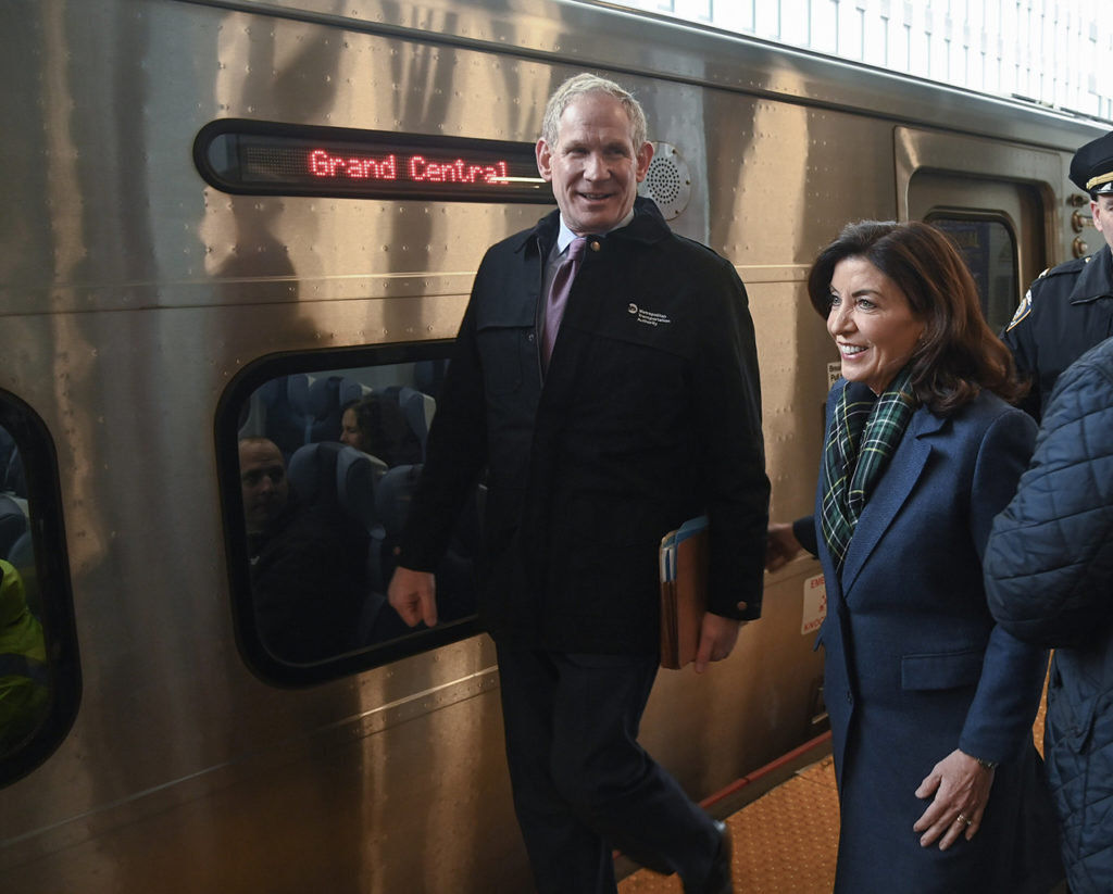 After the train arrived, there was a press event at the mezzanine level. Hochul and Lieber shared the spotlight. Hochul led off, saying, “We got the job done.” She cited “roadblocks, detours and challenges” along the way and said that she is the ninth governor since the project began. She added: “There’s nothing you can’t do in the State of New York” and said that there will be no more “going to Penn and doing a backtrack to the East Side.”