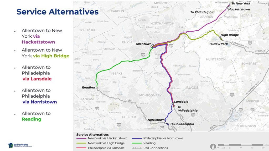 The event was officially called a “Stakeholder Coordination Meeting.” It included public participation and a slide presentation (download below) that described the alternatives for route from Allentown to the New York area, Philadelphia, and Reading. Each of them would require agreements with one or two other railroads from the group consisting of Norfolk Southern, SEPTA or New Jersey Transit. Yet, the study is preliminary and did not include any outreach to those railroads.