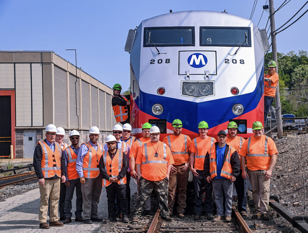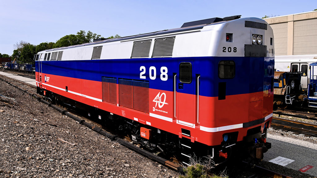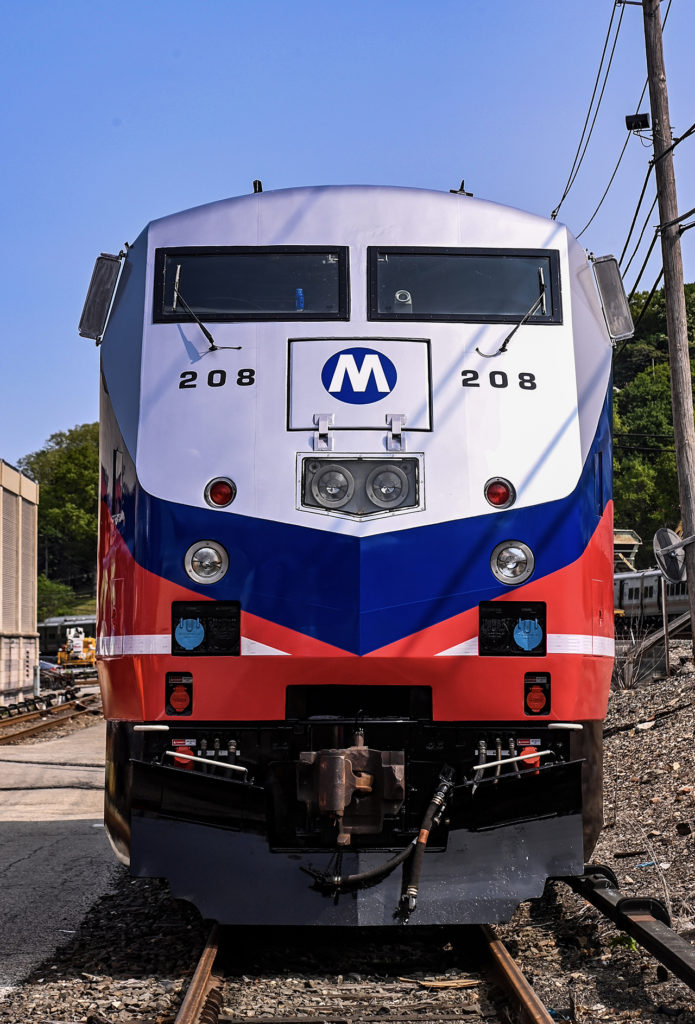 Craft workers at Metro-North’s Plains Maintenance of Equipment Repair Facility applied a vinyl wrap to P32ACDM No. 208, the first locomotive to be rebranded, and one of 31 such units the railroad uses on its northern Hudson and Harlem Lines and the New Haven Line’s Danbury and Waterbury Branches. The silver, blue and red livery pays homage to Metro-North’s original design created upon the railroad’s founding in 1983 and applied to its dual-mode (diesel/third-rail) FL9 locomotives and worn by them until the last unit was retired in April 2007.