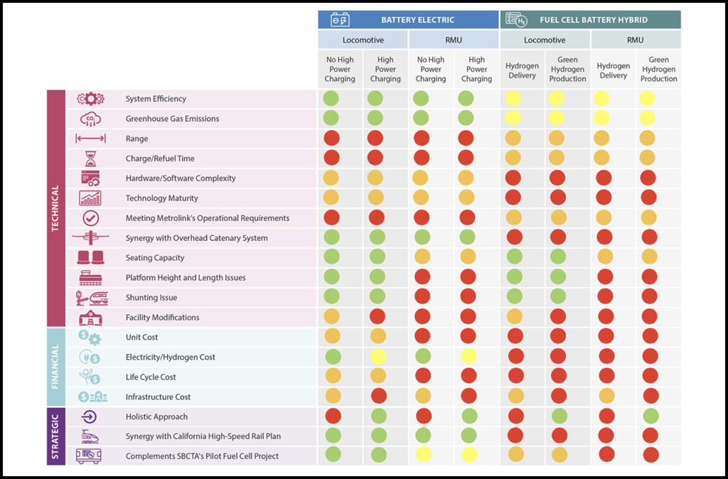 A key goal of the analysis—released last June by Hatch LTK, STV Inc., and Cambridge Systematics, Inc.—was to advance planning for a zero-emissions pilot that is included as part of the Transit and Intercity Rail Capital Program (TIRCP) Metrolink Antelope Valley Line Capital and Service Improvements Project grant received in 2020. Metrolink, in partnership with its member agency, Los Angeles County Metropolitan Transportation Authority (Metro), was awarded $10 million in Network Integration funding to assess the feasibility of a rail multiple unit (RMU) and zero-emissions propulsion service through a pilot project on the Metrolink Antelope Valley Line, according to the analysis authors. The line connects riders along a 76-mile corridor from Lancaster in North Los Angeles County to Los Angeles Union Station in Downtown Los Angeles. The table below summarizes the findings in a condensed form to compare the available options; the evaluations are performed according to the color codes, with green, yellow, orange, and red showing sequentially the degree of the advantage (green and yellow colors mean superior to the diesel-electric propulsion, and red and orange colors mean inferior to the diesel-electric propulsion).