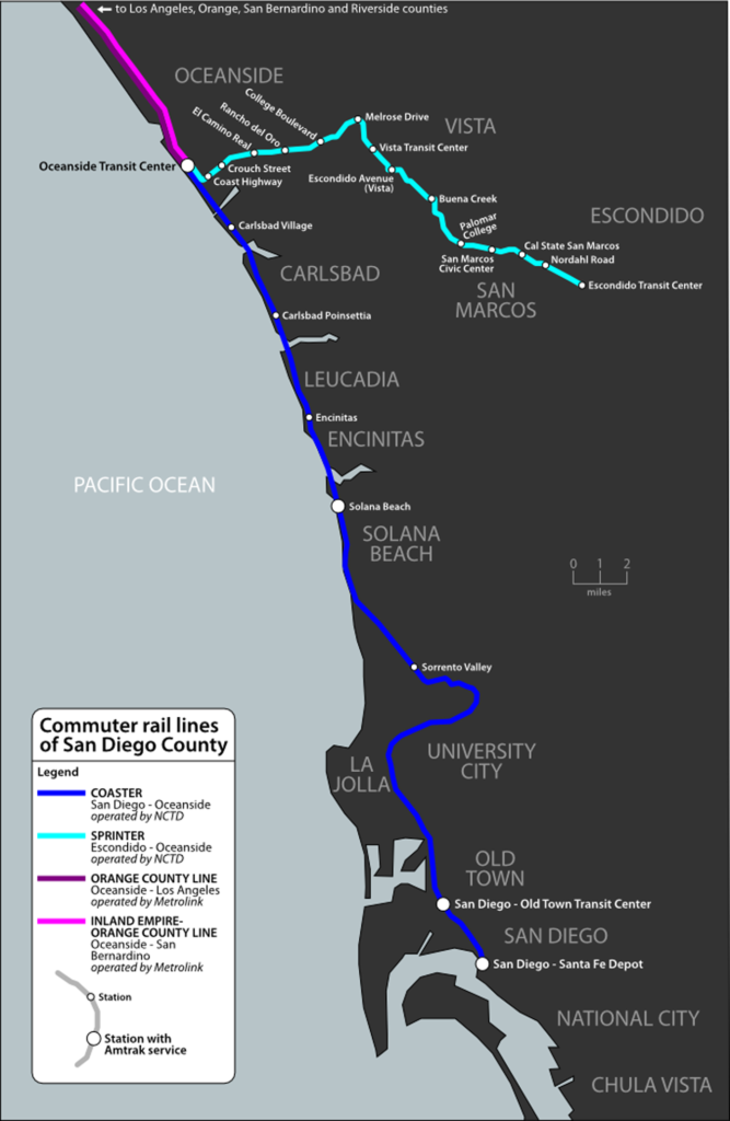 The 41-mile, eight-station Coaster line runs from Oceanside to downtown San Diego with five locomotives and 28 bi-levels (see map below). Coaster connects with Amtrak’s Pacific Surfliner at Oceanside, Solana Beach, Old Town Transit Center, and Santa Fe Depot in San Diego; with Southern California Regional Rail Authority’s (SCRRA) Metrolink commuter rail system at Oceanside, which provides connecting service to Orange, Los Angeles, Riverside and San Bernardino counties; and with NCTD’s Sprinter hybrid rail service at Oceanside, which covers 22 miles through 15 stations between Escondido and Oceanside and includes 12 Siemens Mobility Desiro diesel multiple-unit (DMU) trainsets. It also links with San Diego Trolley and Metropolitan Transit System buses. Coaster marked 25 years of service Feb. 27, 2020.