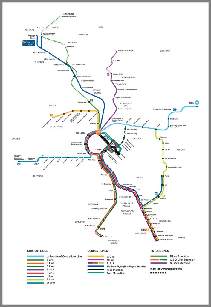 FasTracks is RTD’s voter-approved transit expansion program for the Denver metro region. Voters in eight counties in 2004 agreed to bump up sales-tax rates by 0.04% to make FasTracks happen. To date, RTD has built 25.1 miles of light rail lines and 53 miles of commuter rail lines, launched the Flatiron Flyer bus rapid transit service, and opened an intermodal hub at Union Station in downtown Denver.