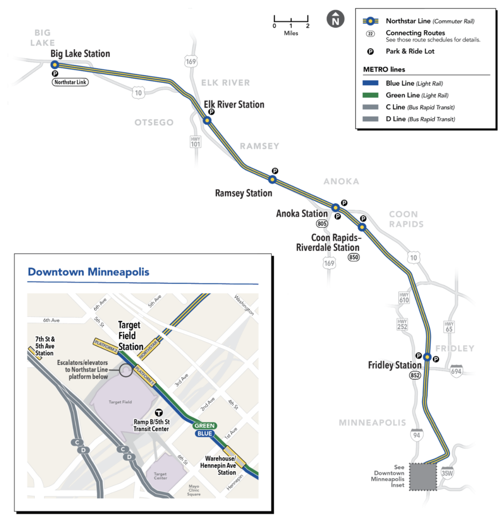 The 40-mile Northstar service in the Northstar corridor opened Nov. 16, 2009, between downtown Minneapolis and the northern city of Big Lake (see map, right); it was originally envisioned to link with St. Cloud, but connects to that city via bus. From 2011 through 2019, it carried between 2,200 and 3,300 weekday riders during the morning and evening peak commute hours; it also featured special event service on evenings and weekends for Minnesota’s Twins, Vikings, and University of Minnesota Gopher sporting events. MotivePower (Wabtec) MP36PH-3Cs power the trains, which comprise Alstom (originally Bombardier) bilevels.