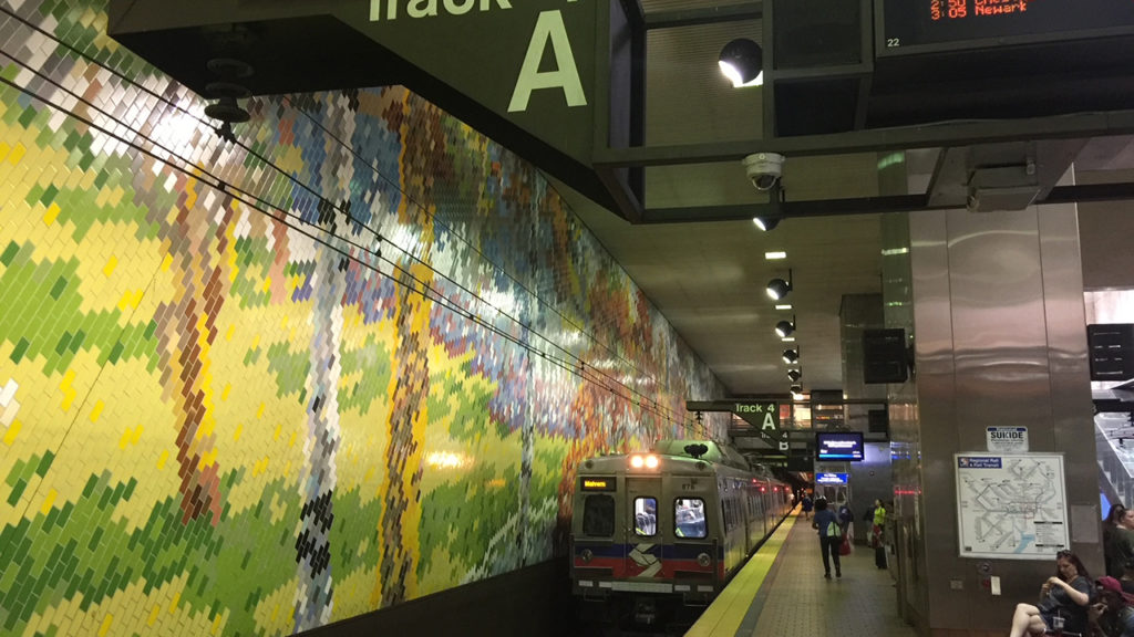 The great innovation for those systems is that since November 1984, trains have started at the outer end of one line on the former Pennsy or Reading system, run through Center City Philadelphia, exited on one of the lines of the other system, and terminated at the outer end of that line. Before that time, Reading trains originated at Reading Terminal, a beautiful 1893 edifice that hosted those trains for more than 90 years, in addition to trains that went beyond commuting distance until 1981. The building is still standing as part of the Pennsylvania Convention Center. The head house and train shed have not been demolished, but lines built into the floor indicate where the tracks once terminated. One reminder of the old terminal that is still an integral part of city life is the Reading Terminal Market north of the station, which was founded in 1893 and remains a prominent part of the city’s burgeoning food scene.