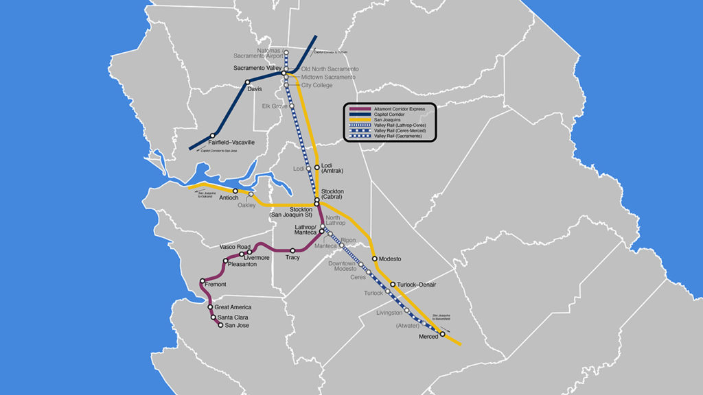 Valley Rail is a joint program that includes improvements and expansions of both ACE and Amtrak San Joaquins focused on improvements between Sacramento and the San Joaquin Valley. It implements two new daily San Joaquins round-trips to better-connect San Joaquin Valley travelers with the Sacramento Area, and extends ACE service between Sacramento and Merced. In addition, Valley Rail will convert the entire fleet, including Amtrak’s Thruway bus network, to renewable diesel fuel, providing greenhouse gas (GHG) benefits across the entire existing 449 track-miles and proposed expanded (119 track-miles) San Joaquins and ACE services.