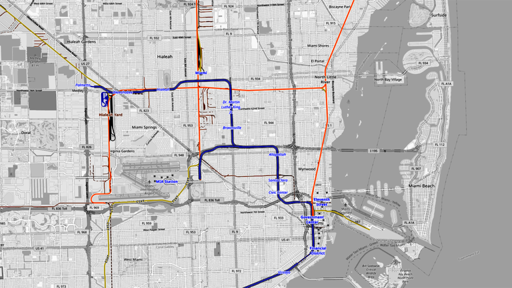 Tri-Rail trains are scheduled to test from June 19 through June 23, between 11:00 a.m. and 5:00 p.m. They will be routed from the South Florida Rail Corridor (SFRC) where Tri-Rail normally operates onto the FEC just south of the Metrorail Transfer Station. They will operate at a maximum speed of 40 mph on the approximate eight-mile right-of-way, starting from Hialeah eastbound and onto the east-west portion of tracks currently in use by FEC freight trains only, then continue south at Little River to the FEC tracks currently in use by Brightline.