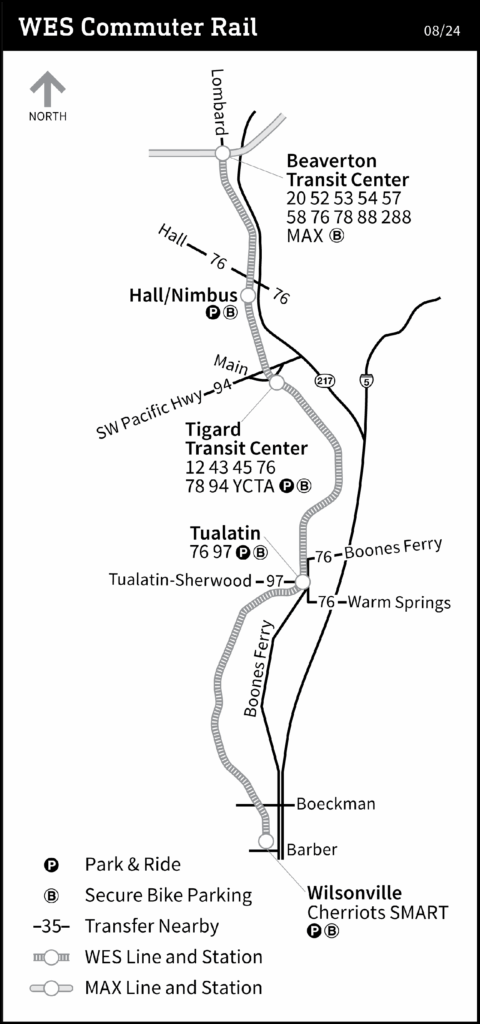 The ride on WES is scheduled to take 27 minutes to the outer end at Wilsonville, south of Portland and north of Salem, the state capital. It has three intermediate stops at Hall/Nimbus, Tigard, and Tualatin, and those are also served by TriMet buses. TriMet’s fare integration includes WES, and Beaverton has standard fare machines. Machines at other stops don’t accept cash, though. That includes Wilsonville, at the line’s southern end. WES also connects with buses operated by other providers: Yamhill County Transit at Tigard, the Tualatin Shuttle in that town, and buses to Salem at Wilsonville.