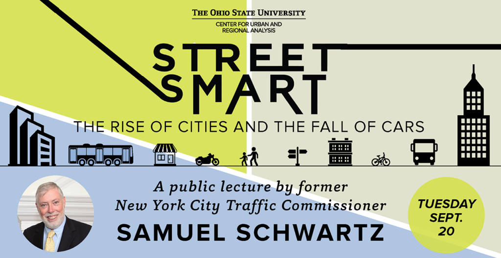 2016 Ohio State University Center for Urban and Regional Analysis promoting a lecture by former New York City Traffic Commissioner “Gridlock Sam” Sam Schwartz on his 2015 book, “Street Smart: The Rise of Cities and the Fall of Cars.”