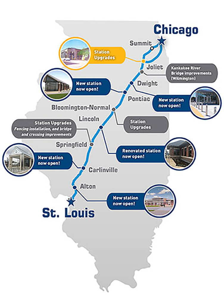 After roughly 20 years of development, HrSR (higher-speed rail)* with speeds up to 110 mph will be in effect as of June 26 on Amtrak’s 284-mile Chicago-St. Louis corridor, on Lincoln Service and Missouri River Runner trains (300, 301, 302, 305, 306, 307, 318 and 319), as well as on the Texas Eagle. Trip time is reduced by 15 minutes from 90-mph run times and 30 minutes from 79-mph run times—less than two hours from Chicago to Bloomington-Normal and less than three hours to Springfield, with end-to-end St. Louis-Chicago schedules of under five hours.