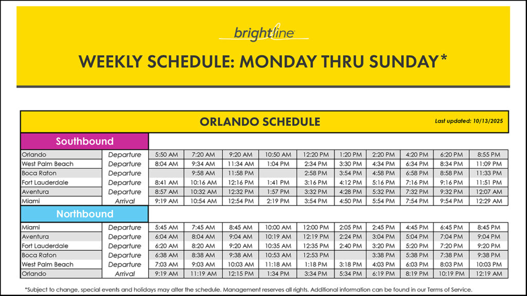 It appears that Brightline is heading toward a “commuter rail” scheduling model. On its website, Brightline proclaims a new slogan: “Our Florida on Your Schedule.” The new schedules can be found at https://www.gobrightline.com/train-tickets/new-schedule/orlando-schedule, but they do not appear to comport with Brightline’s slogan.
