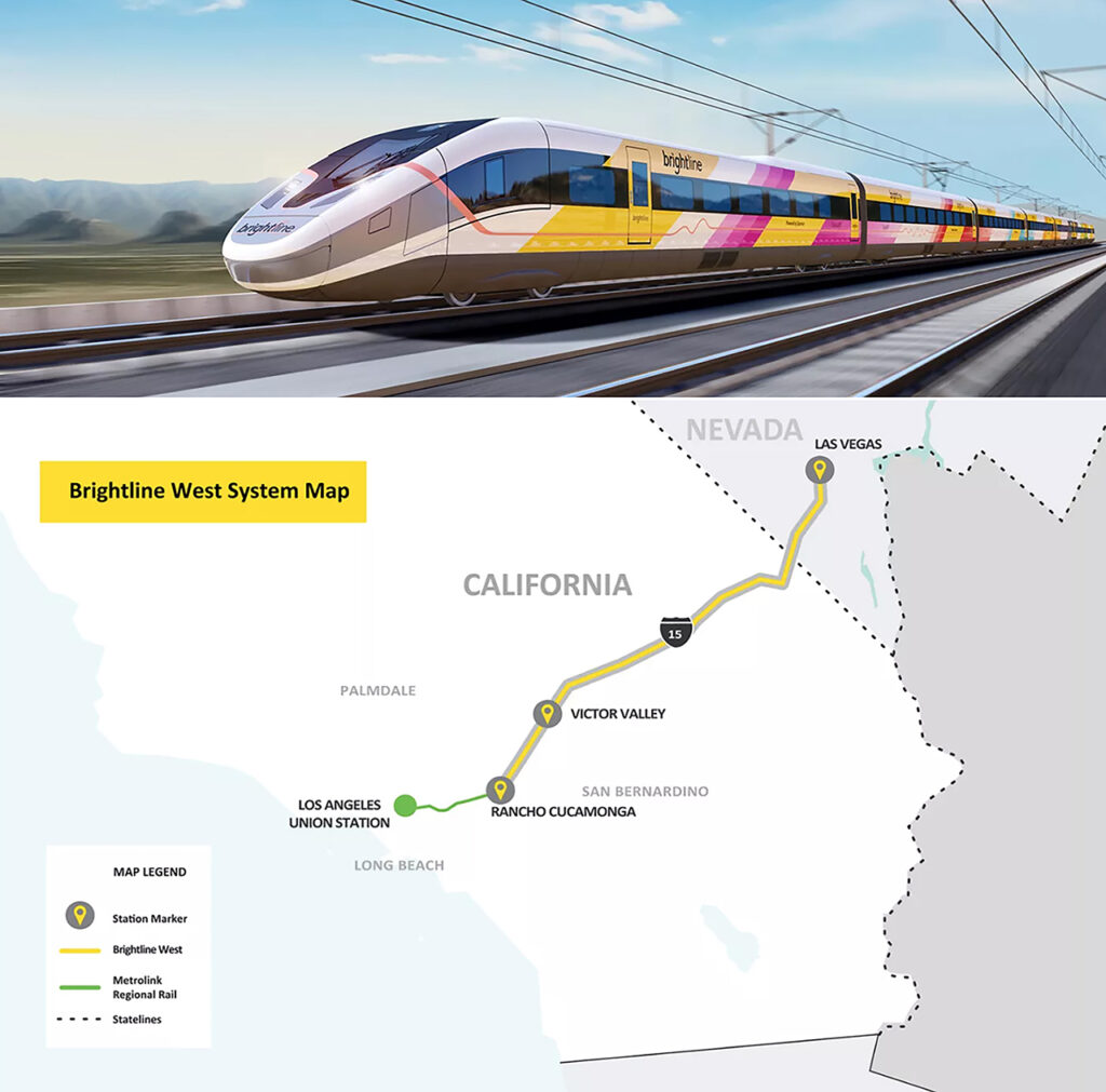 Plans also call for an extension to a “Southern California Station” (as the Brightline West website, www.brightlinewest.com, calls it) at Rancho Cucamonga. That location is currently served by the San Bernardino Line on Metrolink, which runs regional trains, mostly to and from Los Angeles. Brightline West says that the station “will be co-located with existing multi-modal transportation options, including Metrolink, for seamless connectivity to Downtown Los Angeles and other destinations through Los Angeles, Orange, San Bernardino, and Riverside Counties.” That’s where Metrolink goes.