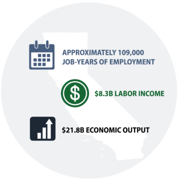 The project has created an estimated 109,000 job-years of employment and more than $8 billion in total labor income earned by those working on the project. The Authority also estimates the service from Merced to Bakersfield, when completed, will result in 333,000 job-years of employment and a total economic activity of $70.3 billion. The build-out of the 494-mile Phase 1 System between San Francisco and Los Angeles by way of the underway Central Valley section would create 1,034,000 job-years of employment and a total economic activity of $221.8 billion.