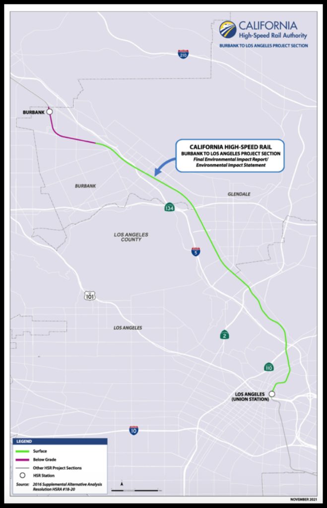 The section will connect the high speed rail system from a new Hollywood Burbank Airport Station to the existing Los Angeles Union Station, providing an additional link between downtown Los Angeles and the San Fernando Valley.