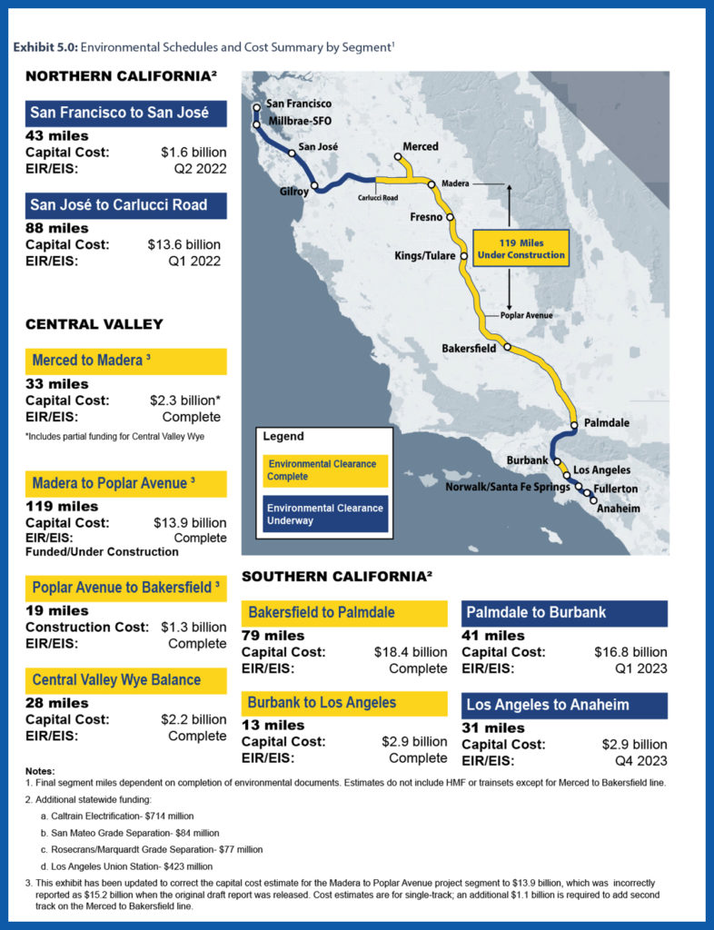 Already, 422 of the project’s 500 miles between San Francisco to Los Angeles/Anaheim have been environmentally cleared, according to CHSRA, which on Sept. 2 released for public review the Draft Environmental Impact Report/Environmental Impact Statement (EIR/EIS) for the Palmdale-Burbank segment of its 500-mile Phase 1 system from San Francisco to Los Angeles/Anaheim.