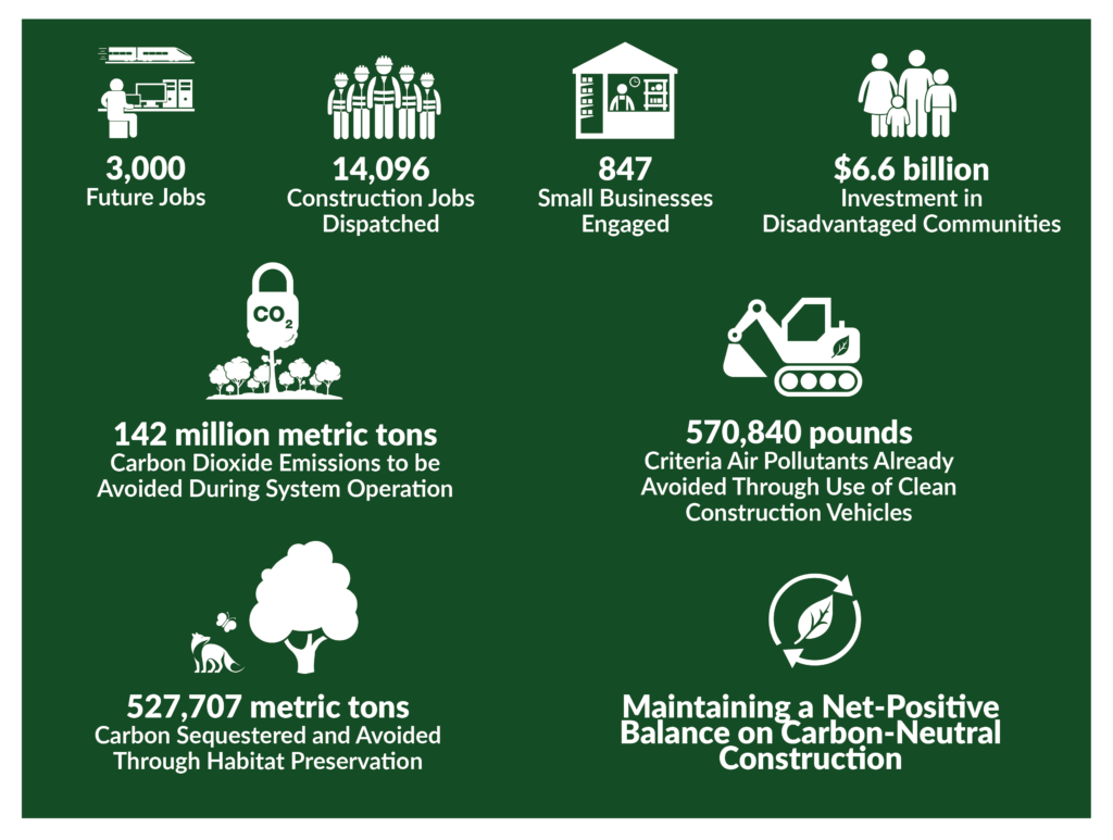 “Realizing California’s core goal of carbon neutrality is why we are building this state-of-the-art, resilient high-speed rail system,” said CHSRA Director of Planning and Sustainability Margaret Cederoth. “This report illustrates how investment in cleaner construction practices and disadvantaged communities today delivers meaningful economic, social, and environmental benefits now and paves the way for the greatest long-term benefits: a clean and profoundly more connected California with the nation’s first 220-mph electrified high-speed rail system powered by 100% renewable energy as a centerpiece.”