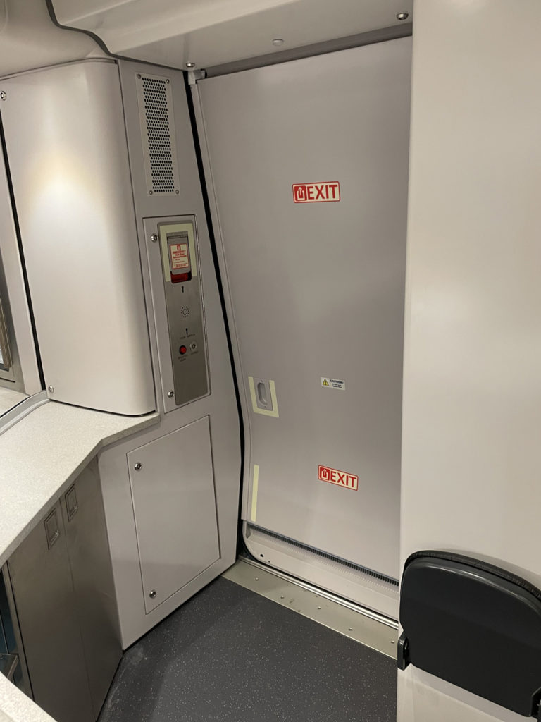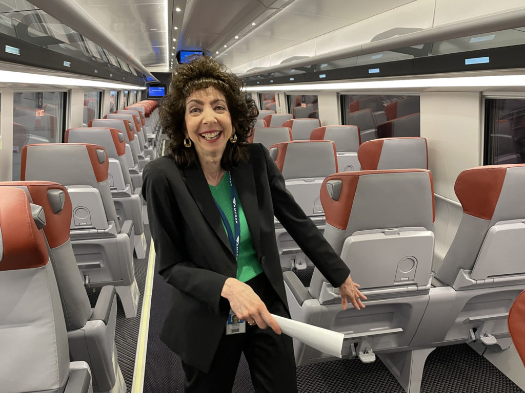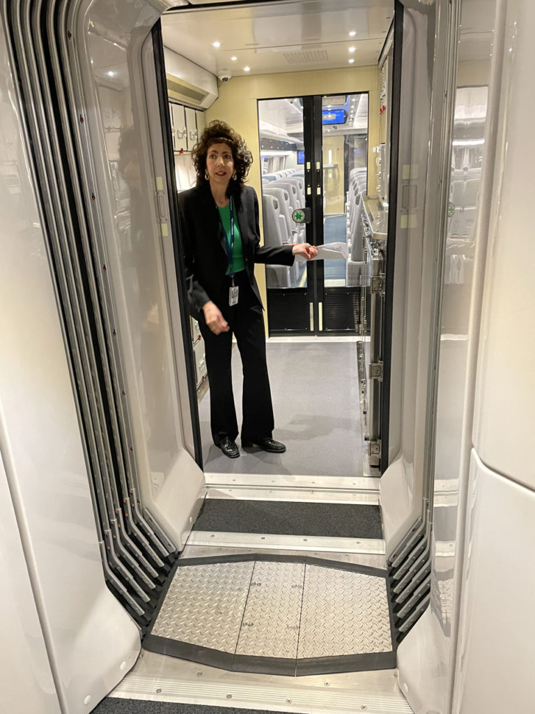 The TGV-based “Avelia Liberty” articulated transits are expected to enter NEC revenue service in early 2023. They have two compact power cars eight articulated intermediate trailer coaches and one centrally located non-articulated café car Certified for operations at up to 186 mph (300 kph), they will operate at a maximum speed of 160 mph on the NEC. Railway Age has covered the trainsets’ manufacturing at Alstom’s Hornell, N.Y. plant and toured an interior mockup in previous articles; this was the first time we’ve seen a completed unit. Suffice to say the overall design and amenities are a vast improvement over the existing Acela trainsets.