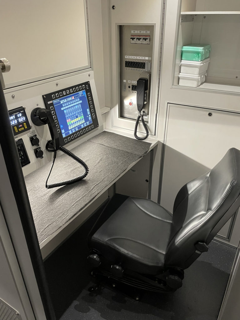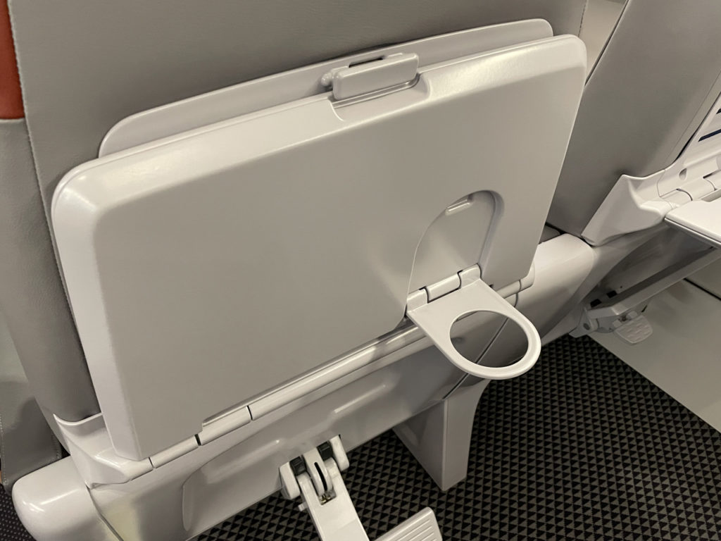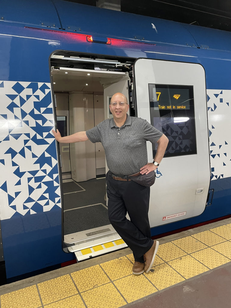 Alstom trainset project manager Noah Heulitt, one of Railway Age’s 2018 “10 Under 40” honorees. Heulitt, previously General Manager of NJ Transit’s Bombardier-operated RiverLINE light rail in 2015, joined Alstom prior to the acquisition of Bombardier.Jon Chalon tries out the First Class section facing tables. Each spot has an individual fold-down section. Tables in Business Class are of the same design.The ADA section in each car has its own table position with a fold-down section.Amtrak Acela II project lead Michelle Tortolani shows off the café car.First Class is 1-2 seating with slightly wider seats than Business Class. Lightweight fold-down tray tables with independent fold-down cupholders (see following photos) are a much-improved design.In addition to traditional railcar overhead luggage racks, each car features extra storage near the doors.The gangways between the articulated cars feature touch-control automatic glass doors.All restrooms are fully ADA-accessible and feature changing tables for passengers with infants.Conductor’s office is located in the café car at the center of the trainset.Each door is equipped with an automatic retractable bridge plate.Like a traditional railroad dining car, the café car features a separate door for loading supplies.The café car features all-stainless-steel equipment, including a Waring toaster (below). If you know a bit about very old popular music, Fred Waring of “Fred Waring and His Pennsylvanians” fame was the financial backer behind the Waring Blender in the 1930s. The company manufactures high-end commercial appliances.2-2 Business Class section.The First Class car has its own galley.The café car features a “grab ’n go” section. The menu (below) is on a digital display.Buffers between the independent non-tilting power cars and active-tilt articulated coaches.All 8 passenger coaches and the café car have longitudinal dampers and air suspension (below). The café is located in the center of the trainset and is independent (non-articulated).Overall, very impressive (not me, the trainset!).