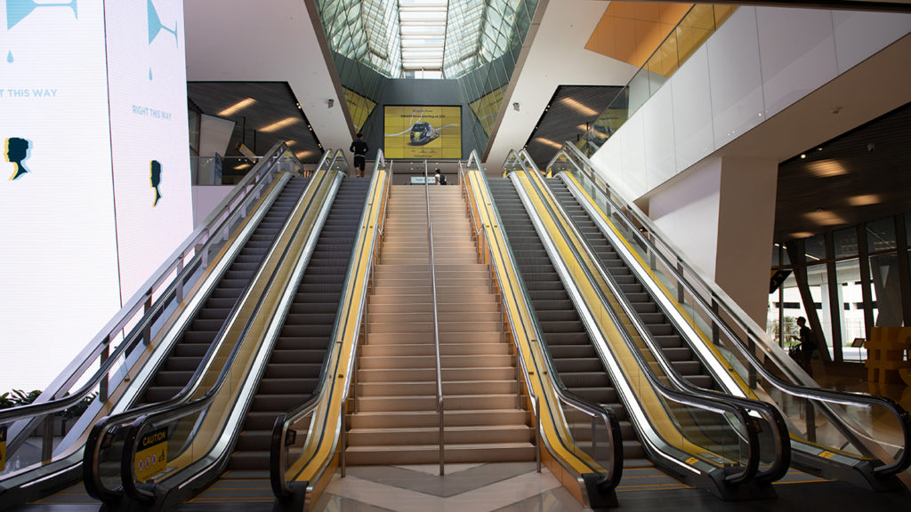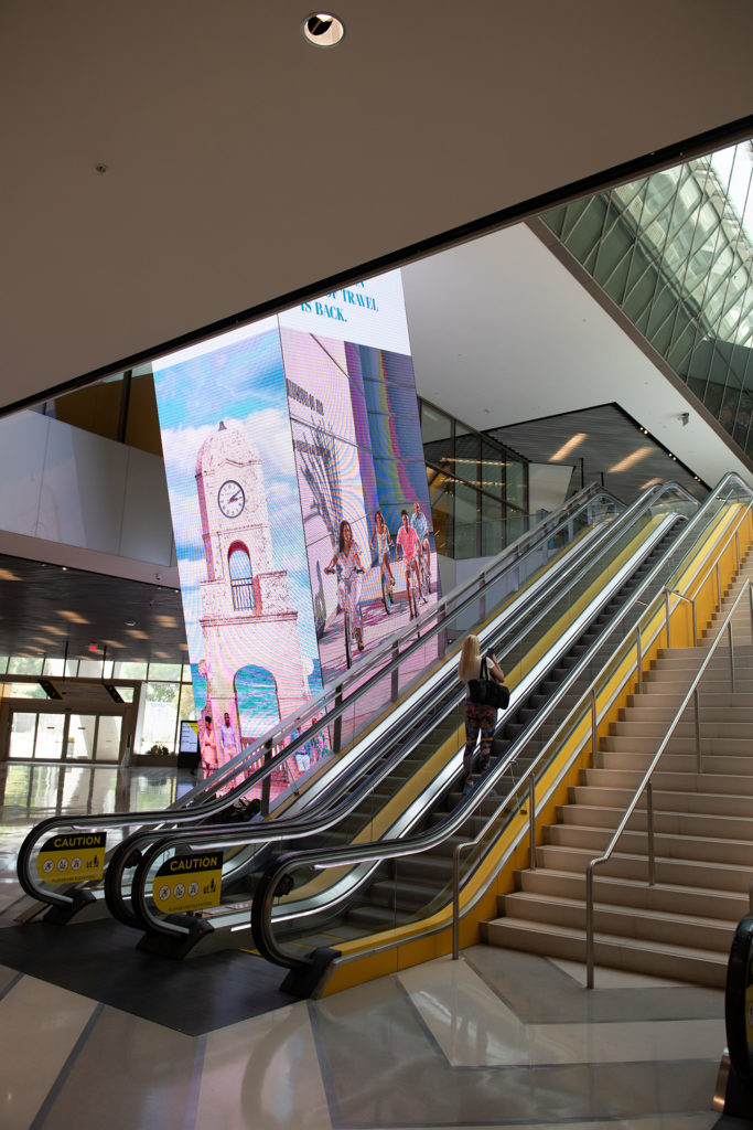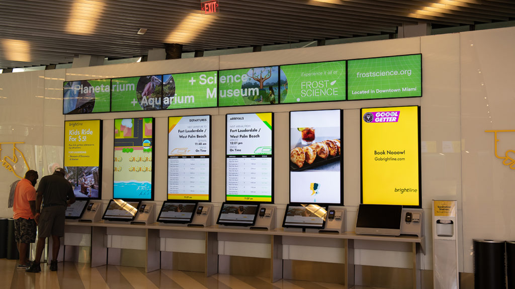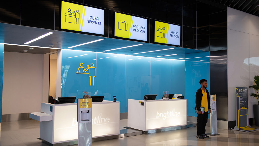 A new and different world awaits passengers about to enter Brightline’s MiamiCentral station. High ceilings, tall windows and clean, bright lighting surround you, and uniformed Brightline personnel are everywhere, ready to take care of any needs or issues. There are two counters at one end of the lobby where you can drop off your baggage. Above are three signs, the center one indicating bag drop, while the two on each side reinforce a big part of the Brightline message: Guest Services. Color tastefully abounds with bright yellow and green trim and a series of lighted kiosks and screens delivering messages and videos about Brightline and community events. And, at this point, you’re still on the first floor, and you’ve walked no more than 50 feet.